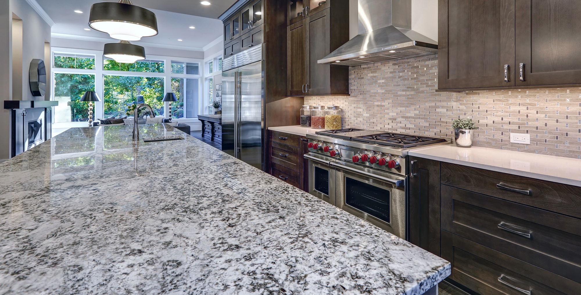 Modern,Kitchen,With,Brown,Kitchen,Cabinets,,Oversized,Kitchen,Island,,Granite